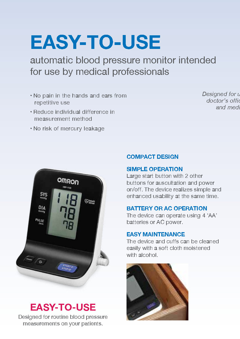 เป็นเครื่องวัดความดันโลหิตอัตโนมัติแบบภายนอก มีขนาดกะทัดรัดสามารถเคลื่อนย้ายได้ไปใช้งานได้อย่างสะดวก เหมาะสำหรับ แผนกผู้ป่วยนอก หอผู้ป่วย หรือ ออกหน่วยแพทย์ที่มีผู้ใช้งานจำนวนมาก